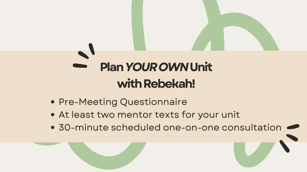 These by-appointment sessions put your learning into practice! Ahead of our individual meeting, you will complete a questionnaire about the writing unit you would like help planning so that I can get to know you and your students. Then, I will select a minimum of two mentor texts that would work for you. We will meet in a 30-minute session to talk through the mentor texts and plan your unit. I will also provide planning resources to help you move forward! This can be bundled with the other Planning Series sessions for an overall reduced price!