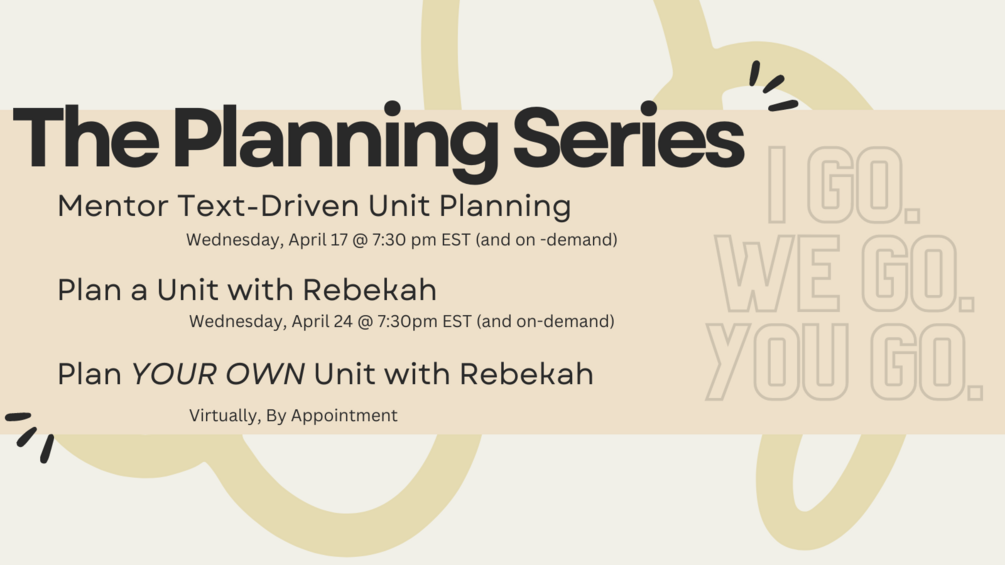 - Session 3: Plan YOUR OWN Unit with Rebekah -- this is where it gets REALLY good. Participants will complete a questionnaire about a mentor text-driven writing unit they wish to plan. Then, Rebekah will get to work pulling mentor texts. We'll meet one-on-one for 30 minutes to talk through the mentor texts and begin laying out your writing unit!